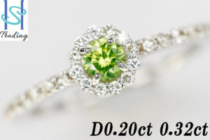 トリートグリーンダイヤモンドを4本爪でセットし、メレダイヤモンドで取り巻いた、華奢ながら優美な一品です☆