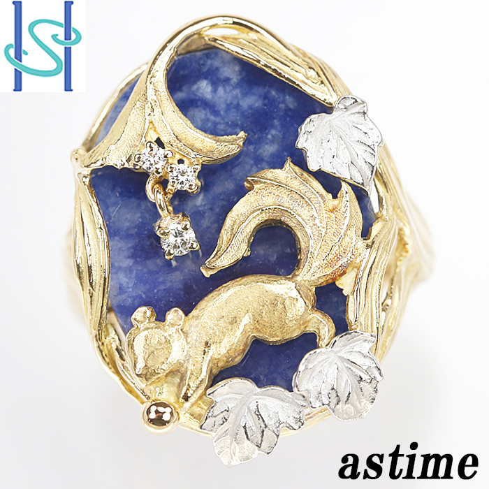 商品名:アズタイム ソーダライト リング K18YG Pt900 As Time 石川暢子 リス 花 フラワー 植物 葉 リーフ ボタニカル アニマル