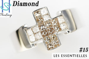 ブラウンのプリンセスカットダイヤモンドをクロスモチーフにミステリーセッティングした、スタイリッシュな一品です。