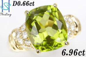 ペリドットの両サイドには、上質メレダイヤモンドをセットした、クオリティも優れた一品です。