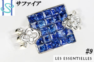 スクエアのサファイアを正方形にミステリーセッティングした、エレガントな一品です。